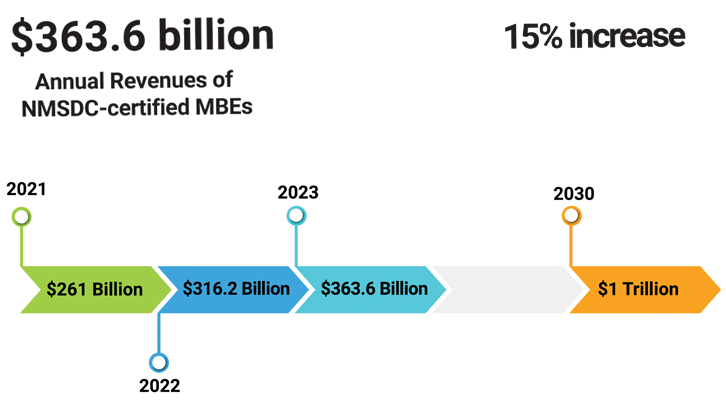 In 2022, as part of the National Minority Supplier Development Council’s (NMSDC) 50th Anniversary, NMSDC launched the March to $1 trillion, an ambitious goal to reach $1 trillion in NMSDC-certified minority business enterprise (MBE) annual revenue.