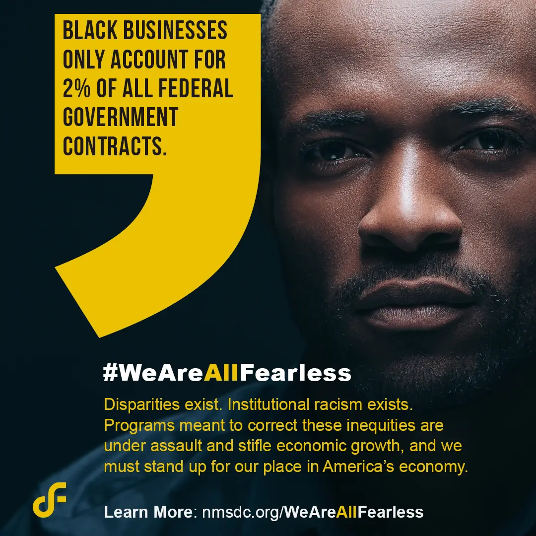 #WeAreAllFearless - [FACTS] U.S. Black entrepreneurs have only received 2% of all available venture capital. U.S. Black businesses only account for 2% of all federal government contracts. Systemic racism exists. You have the power to change that, you have the power to be FEARLESS. Donate today at: https://nmsdc.org/join/we-are-all-fearless/donate/